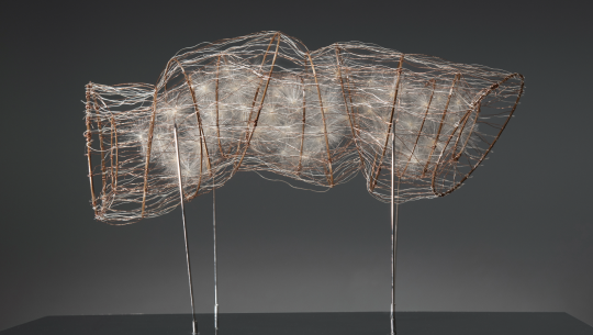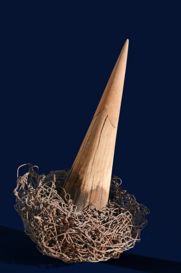 Non loin de là, les sculptures arachnéennes de l’artiste Antonio Crespo Foix, faites de fibres et de fils viennent dialoguer avec les mobiliers précieux du Petit Salon. La Tour de Diane, quant à elle, se fait lieu de recueillement. Pascal Convert y installe une œuvre mystérieuse qui retient le son autant que la mémoire, tant l’artiste est lié aux figures de l’histoire du lieu. Objet d’appel devenu muet, ces cloches nous parlent de la mort, de l’histoire et de la fragilité humaine. Si bleu il y a ici, c’est au cœur. C’est le bleu de la nuit et du deuil.
